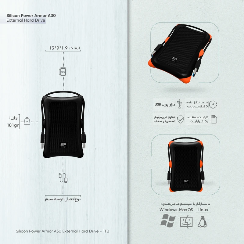 هارد اکسترنال 1 ترابایت سیلیکون پاور مدل Silicon Power Armor A30 با گارانتی 36 ماهه شرکتی
