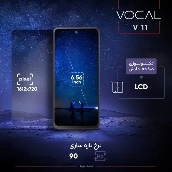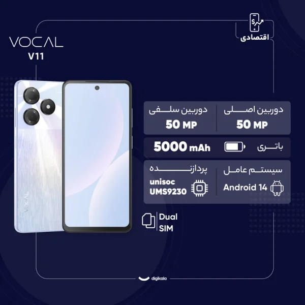برند وکال که تخصص ویژهای در زمینه گوشیهای اقتصادی پیدا کرده است، به تازگی Vocal V11 را معرفی کرده است. این گوشی با ترکیب مناسبی از طراحی زیبا، مشخصات کاربردی و قیمت مناسب، توانسته به فروش خوبی دست پیدا کند. این گوشی با وزنی سبک و بدنهای از جنس شیشه، رزین و پلاستیک، تجربهای خوبی در استفاده روزمره به کاربران منتقل میکند. صفحهنمایش 6.56 اینچی LCD با نرخ تازهسازی90 هرتز و رزولوشن720×1612 پیکسل، برای تماشای محتواهای چندرسانهای و بازیهای سبک گزینهای مناسب است. از طرفی محافظ صفحه Corning Gorilla Glass مقاومت خوبی در برابر خط و خش فراهم میکند. در بخش پردازنده، Vocal V11 از تراشه اقتصادی Unisoc T606 با هشت هسته و پردازنده گرافیکی Mali-G57 استفاده میکند که عملکرد قابل قبولی برای کارهای روزمره و سبک دارد. حافظه داخلی 128 گیگابایت و رم 4 گیگابایتی، همراه با قابلیت استفاده از کارت حافظه، فضای کافی برای ذخیرهسازی دادهها فراهم میکند. دوربین اصلی دوگانه با رزولوشن 50 و 2 مگاپیکسل و دوربین سلفی 50 مگاپیکسلی، عملکردی فراتر از انتظار در عکاسی و فیلمبرداری دارد. باتری 5000 میلیآمپر ساعت نیز همراه با پشتیبانی از شارژ سریع، طول عمر مناسبی ارائه میدهد. در مجموعVocal V11 گزینهای ایدهآل برای کاربرانی است که به دنبال کیفیت در یک گوشی اقتصادی هستند.